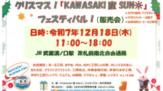 イベント 販売会のお知らせ!12月18日(木)クリスマス!『KAWASAKI産SUNフェスティバル!』が溝ノ口駅で開催! 12月18日(木)11時より、JR武蔵溝ノ口駅改札前の南北自由通路にて、「KAWASAKI産SUNフェスティバル!」を開催いたします。 2025.11.21 イベント